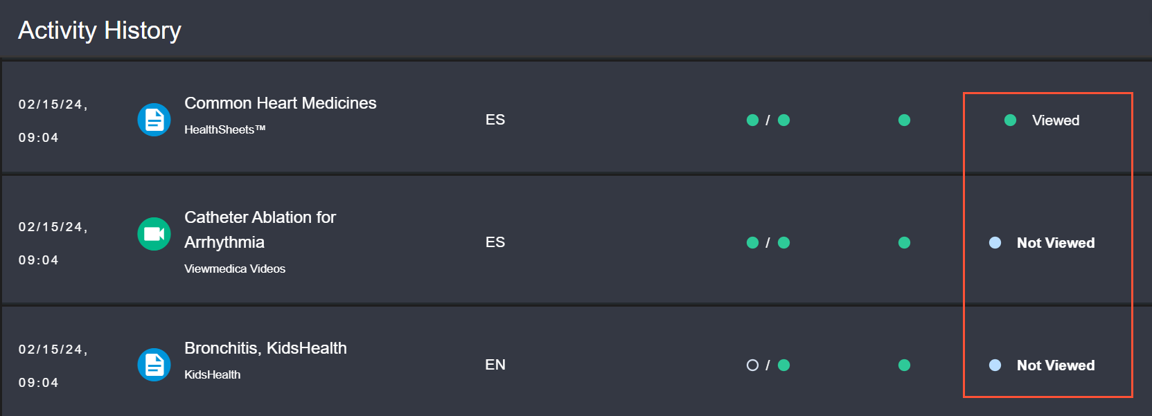In some instances, when education was viewed by the patient in the Patient Portal Integration application, the corresponding Viewed status in the Krames On FHIR Activity History page was not updating as expected.